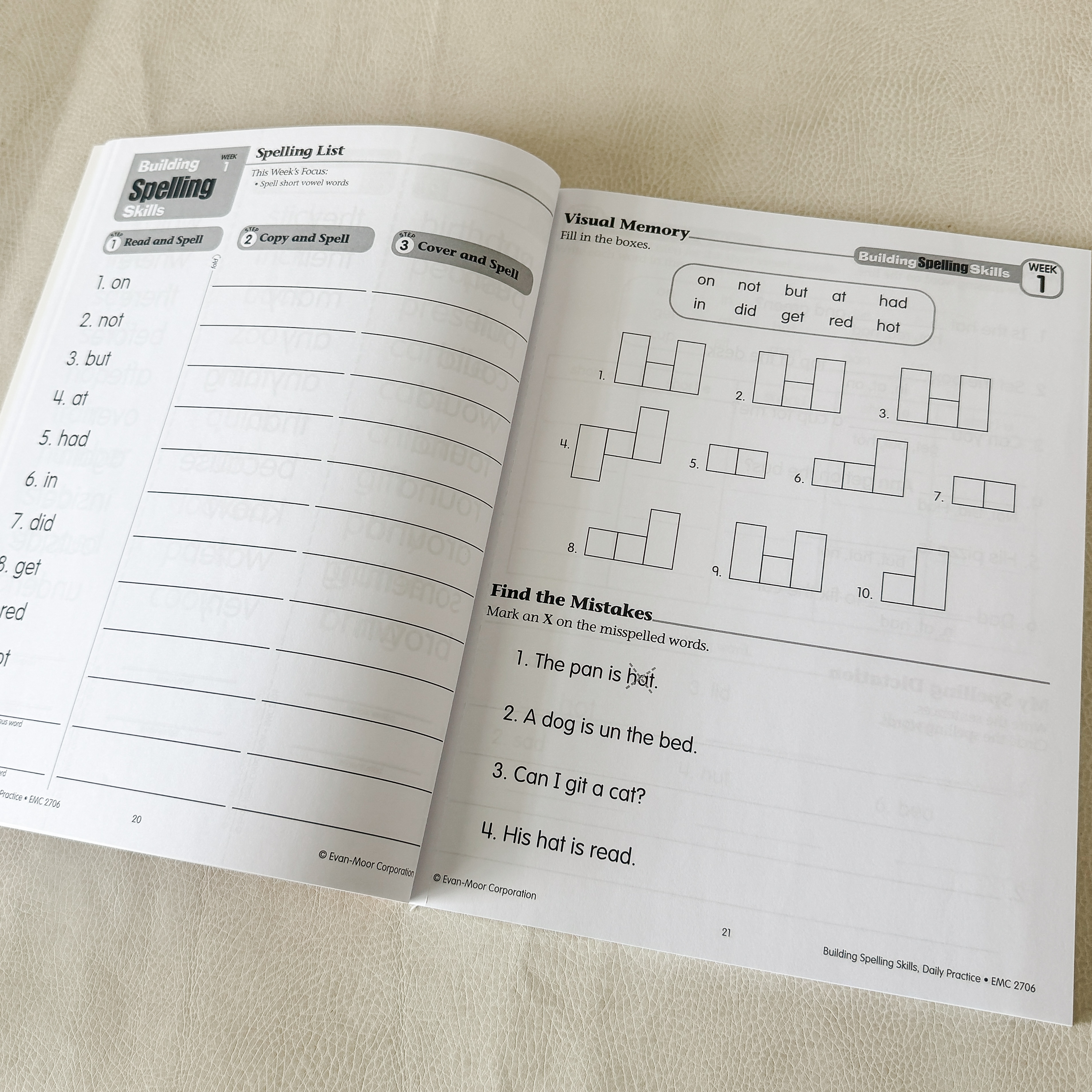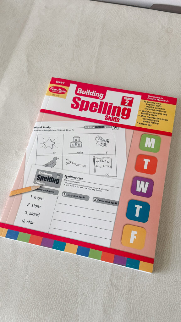 - Spelling. Evan-Moor Building Spelling Skills 2. While TGATB does teach spelling, I’m not a huge fan of the way it’s taught. So, this year we’re going to be using this book to learn spelling this year. Each day there’s a page for kids to complete and at the end of the week, kids complete a spelling test.